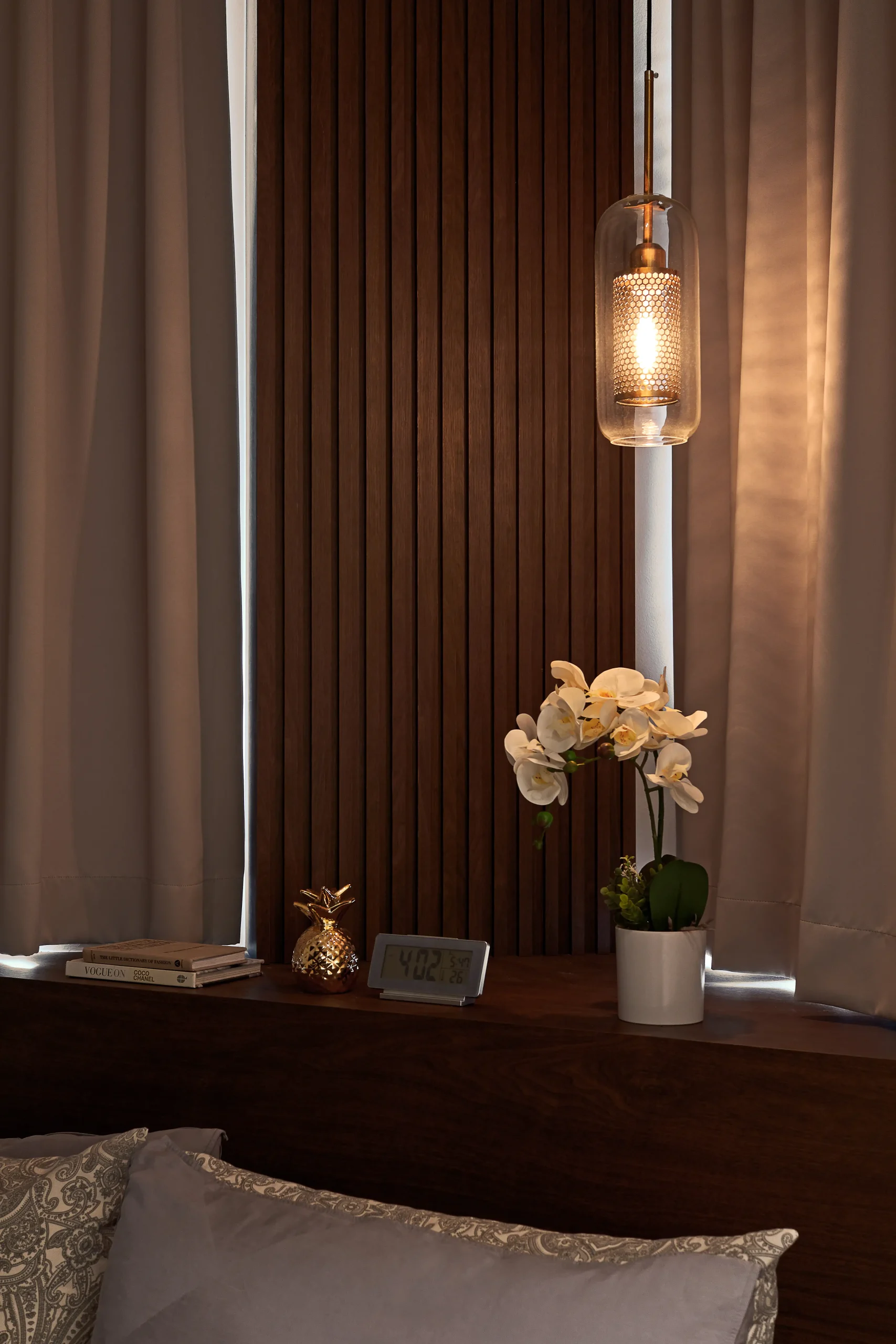 Texture does all the heavy lifting here. Deep timber panels stretch across the walls, occasionally parting like a stage curtain to reveal a boutique walk-in or a perfectly tucked-away appliance garage. There is a beautiful, calculated tension between the icy veins of Carrara marble and the amber glow of recessed LEDs that wash over every corner. Even the kitchen follows the “now you see it, now you don’t” rule, using hydraulic lifts and pull-out trays to keep the machinery of life out of sight, leaving behind nothing but total composure.