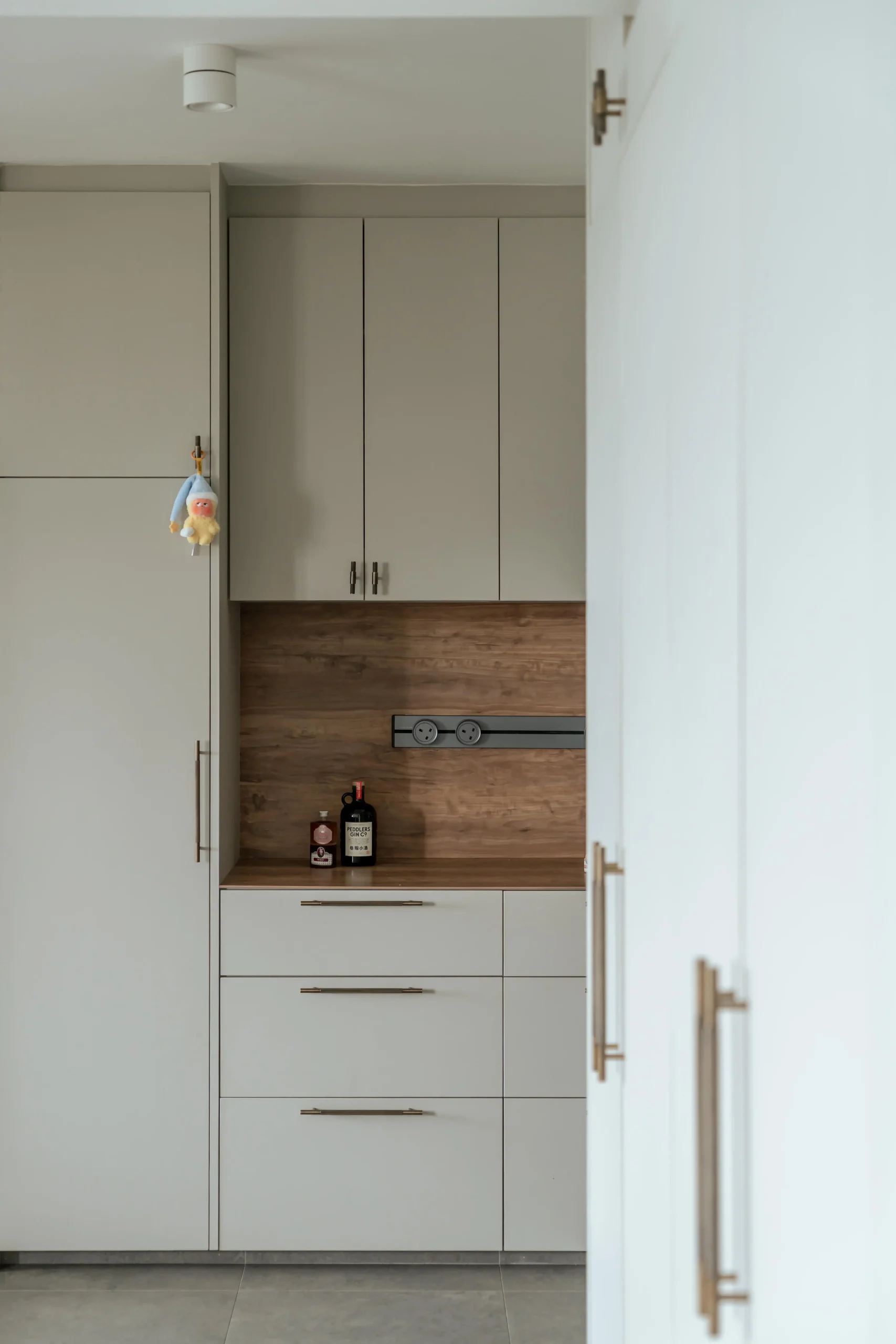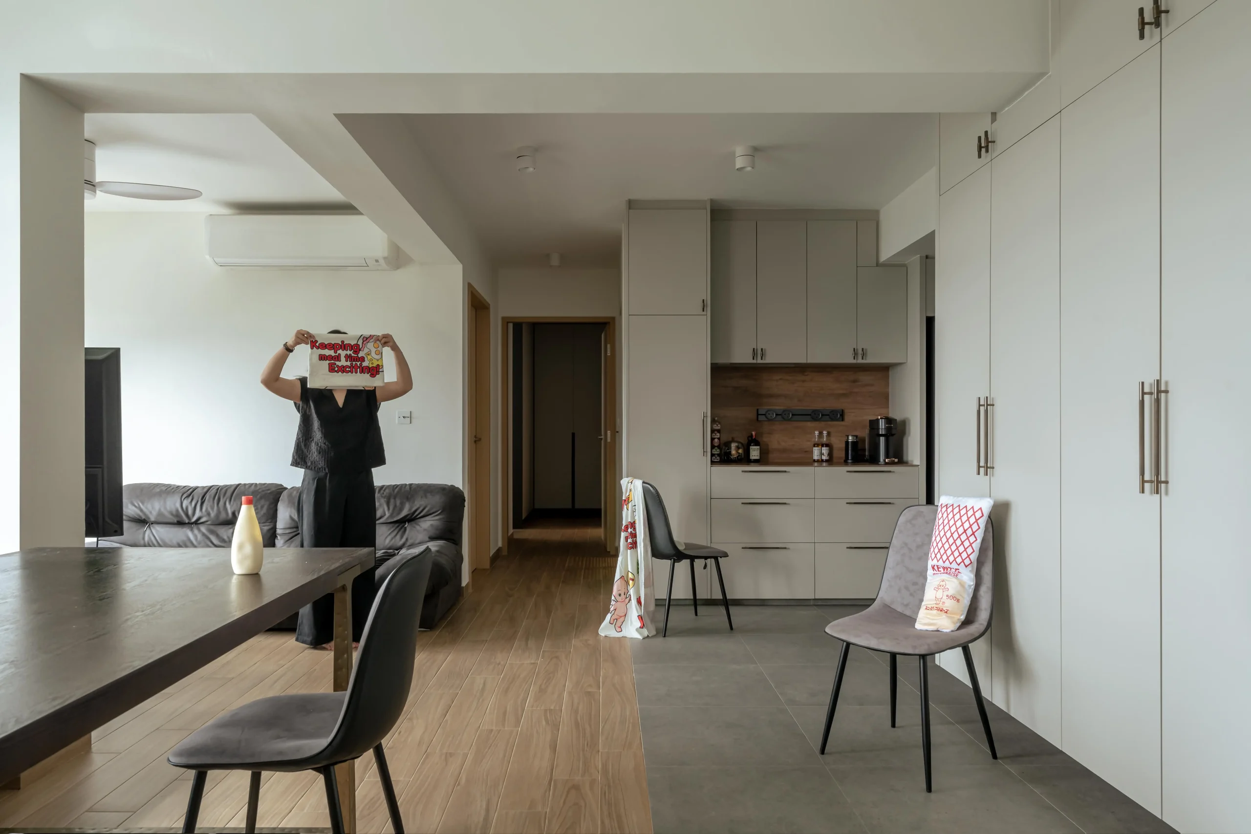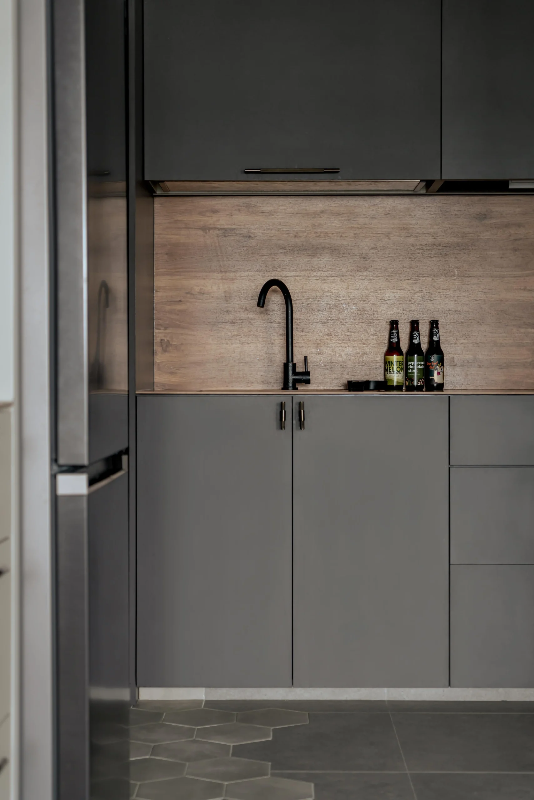 The design plays brilliantly with transitions. Underfoot, grey stone gradually gives way to a cluster of hexagonal tiles, forming a geometric gateway that leads into the kitchen. A slim glass partition preserves visual flow while connecting the culinary zone seamlessly to the rest of the home. Deep charcoal cabinetry pairs with the organic warmth of a wood backsplash, letting the kitchen read more like a piece of custom-crafted furniture.