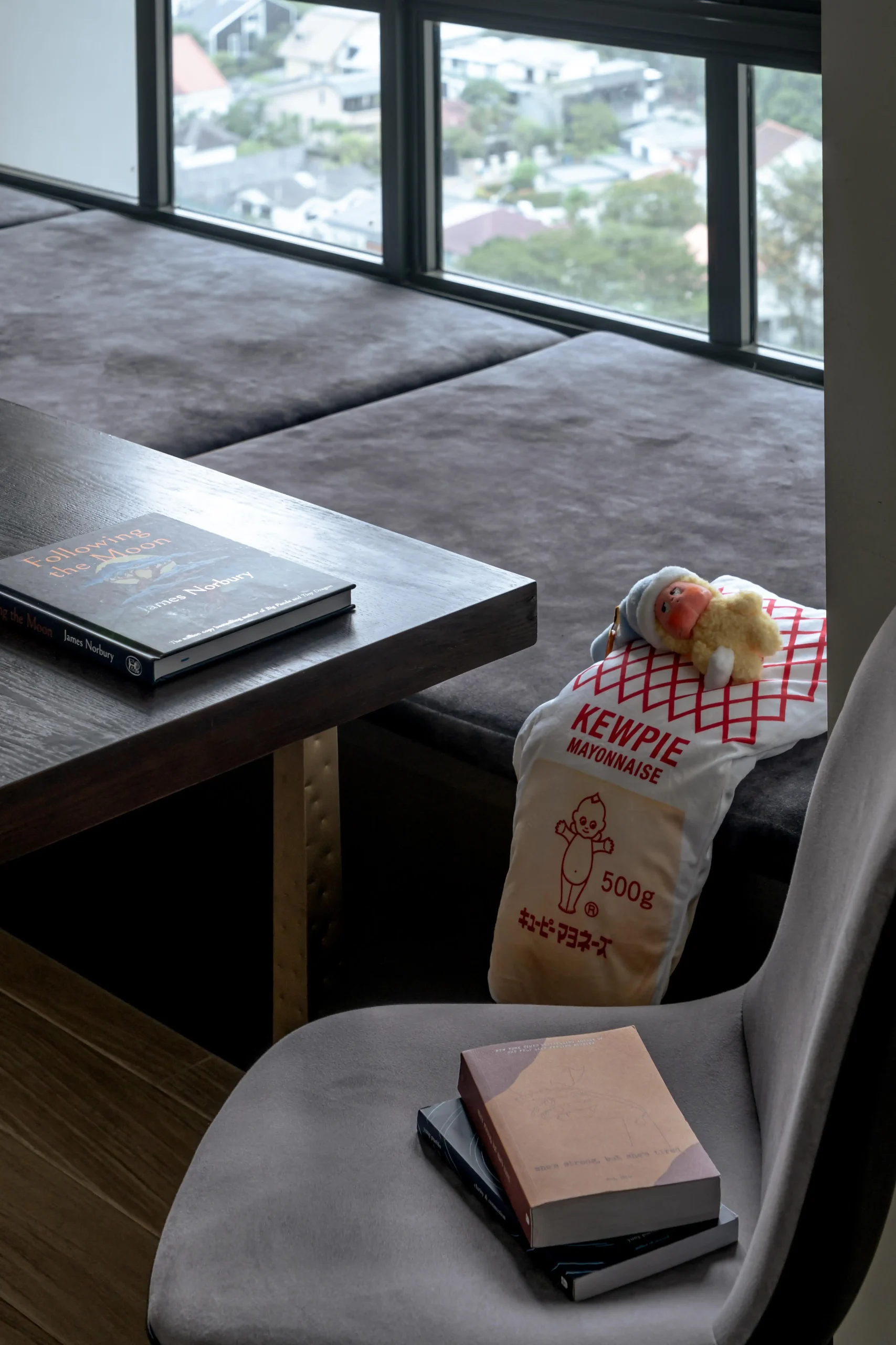 In the living area of this modern minimalist house, a built-in bench replaces the conventional layout, framing the skyline almost like a living painting.